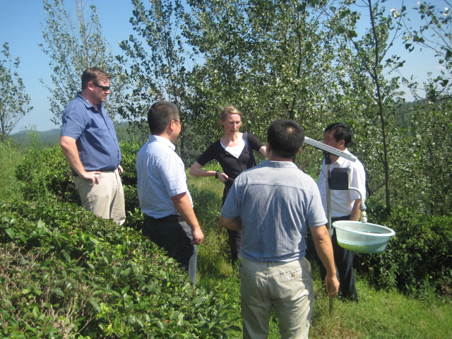 美國客人參觀生態(tài)茶園觀并察看太陽能誘蟲燈